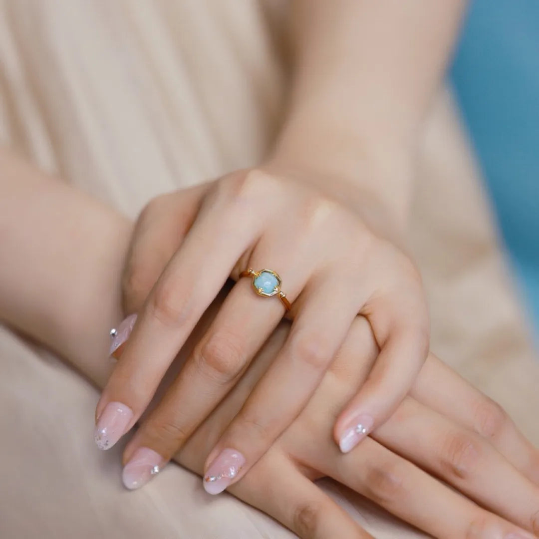 Son design unique en argent S925 doré or souligne parfaitement la forme octogonale de la pierre, maintenue par des griffes délicatement ouvragées, rappelant une corolle florale. La monture fine et féminine sublime les doigts avec légèreté. Disponible en trois tailles (FR51, FR54, FR57), la bague Éclat Subtil s’adapte à chaque main et à chaque moment de vie.