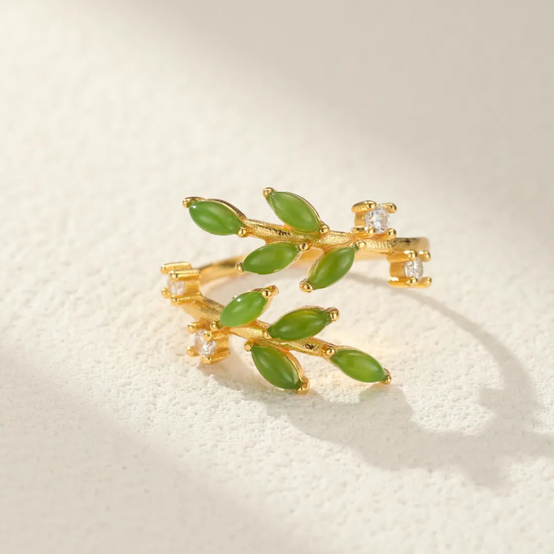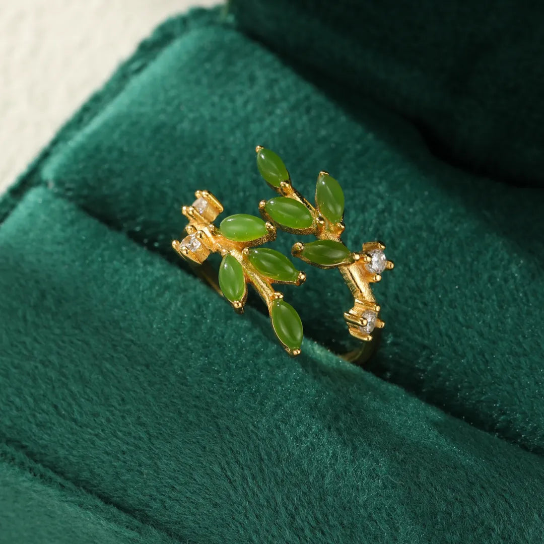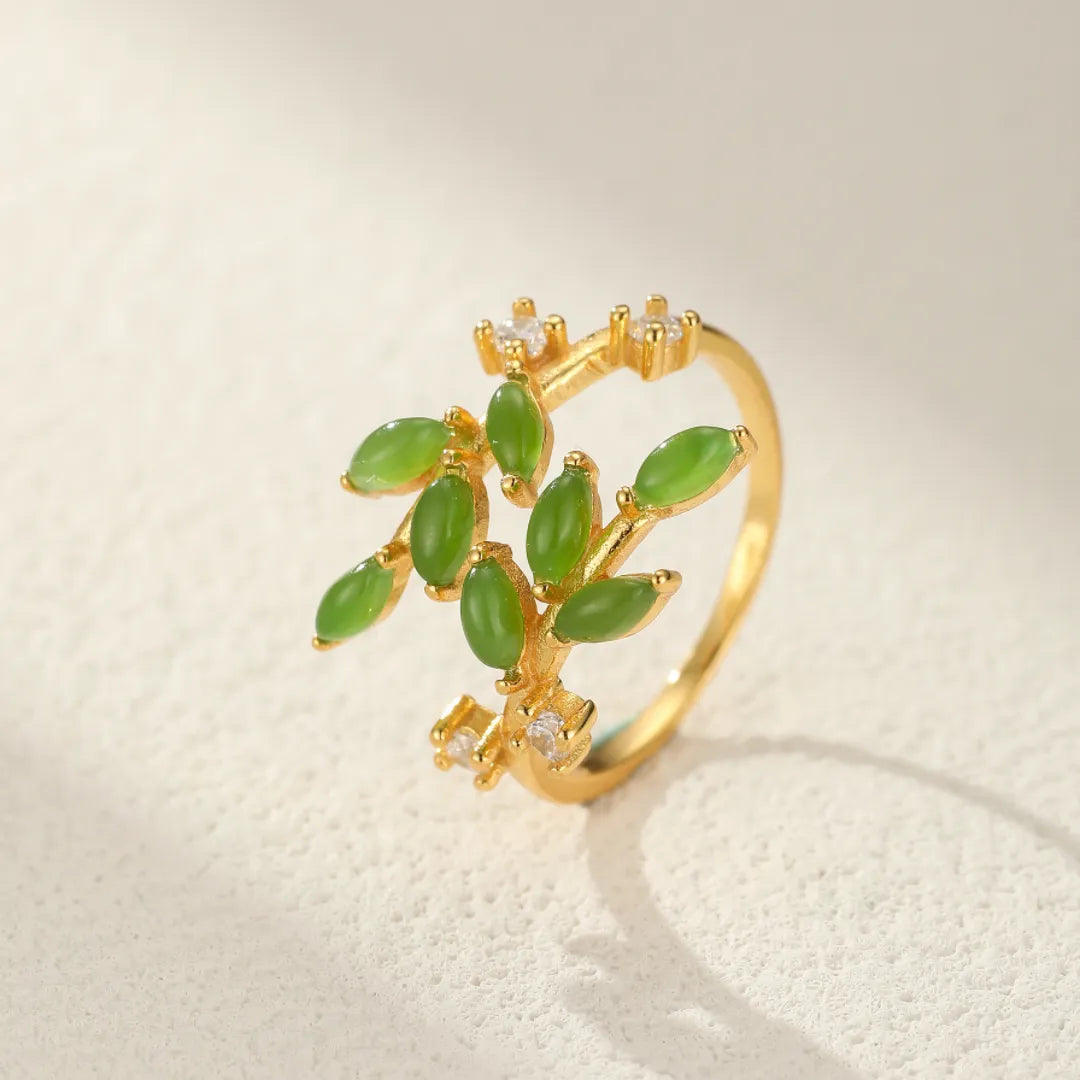 Inspirée des feuillages délicats, la bague Charme de Nature évoque la beauté organique à travers un motif végétal élégant orné de pierres de jade naturel. Chaque feuille, taillée avec finesse, repose sur une monture en argent 925 doré à l’or, illuminée par de petits zircons éclatants.