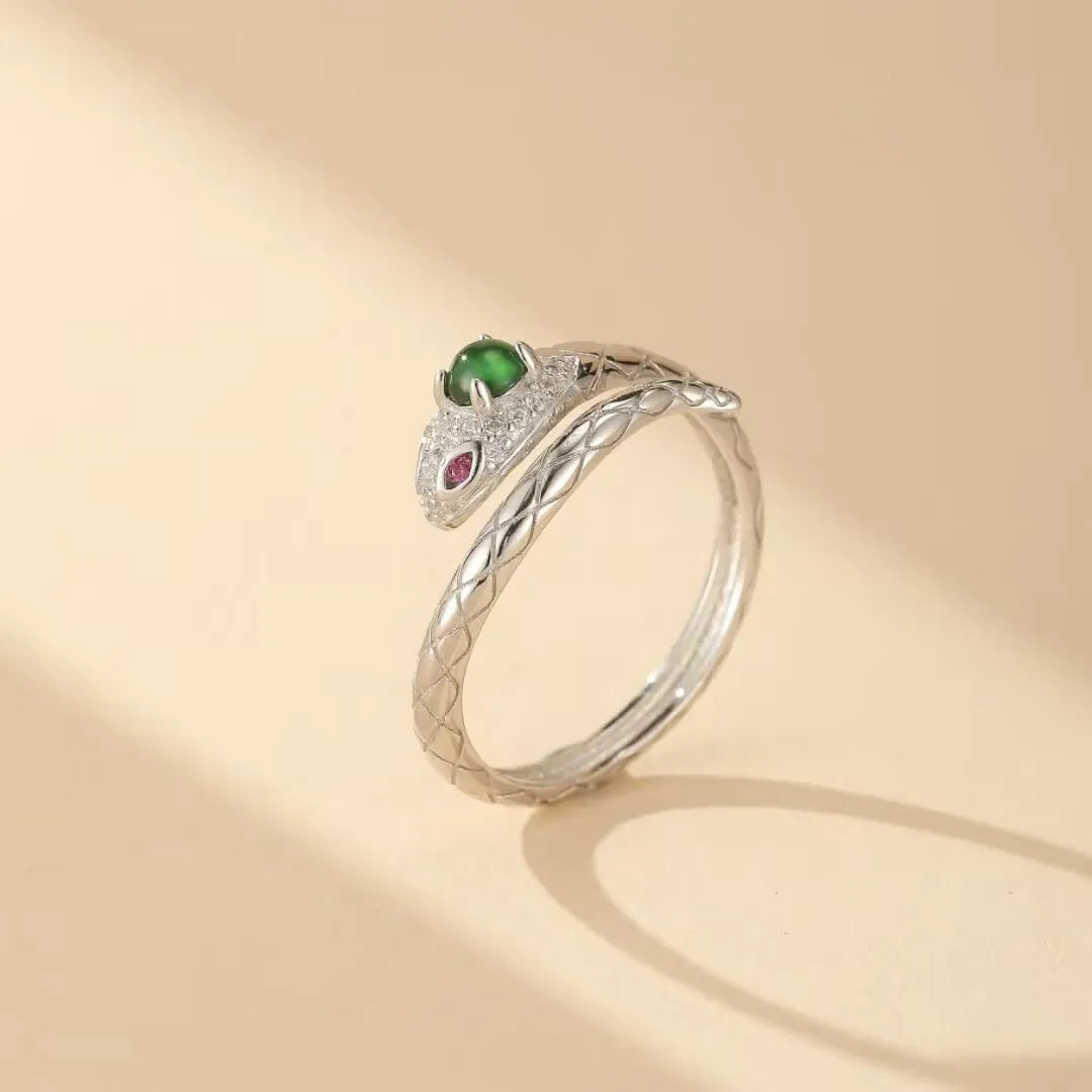 En son centre, un jade naturel vert profond attire le regard et diffuse des vibrations apaisantes, connues pour favoriser l’équilibre émotionnel et la prospérité intérieure. Le regard du serpent est sublimé par de délicats zircons étincelants, ajoutant une touche de lumière à cette pièce captivante.
