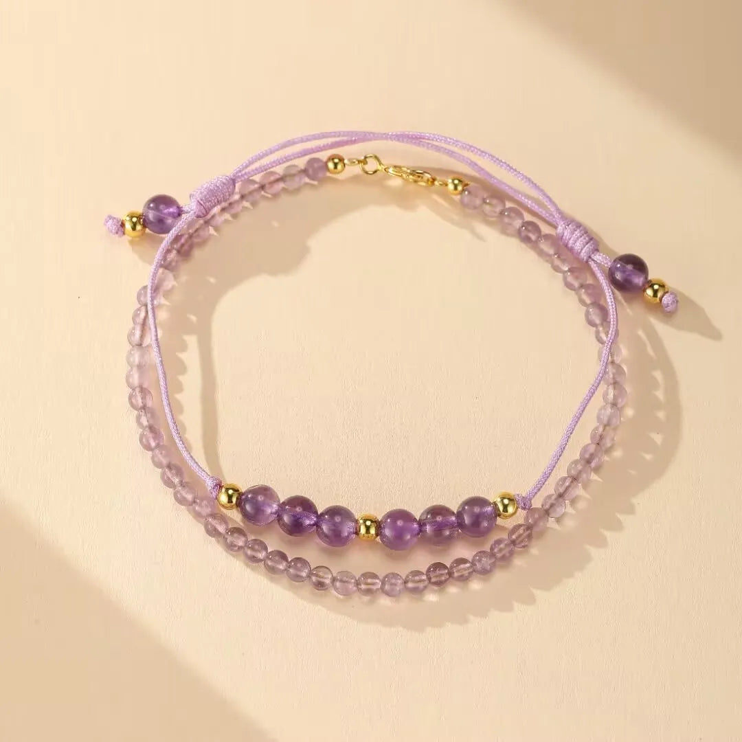 Harmonie Mystère incarne la délicatesse et la puissance de l'Améthyste dans un design raffiné et féminin. Composé de perles naturelles d’Améthyste d’Uruguay (3 mm), ce bracelet double rang offre une palette de violets subtils, rehaussée par des touches dorées en argent S925 plaqué or 14K.
