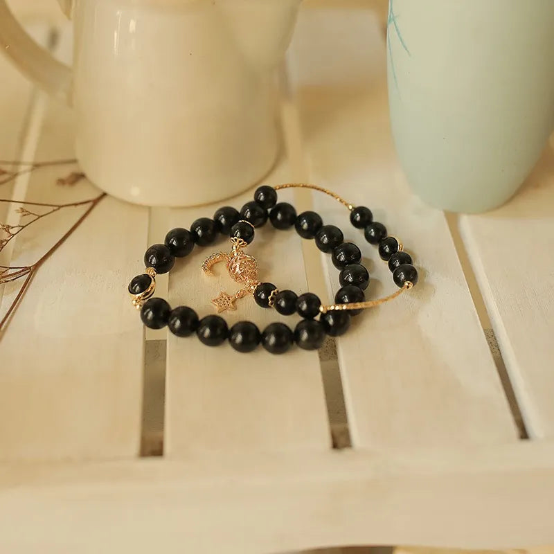 Conçu en argent doré or, ce bracelet offre un contraste élégant entre la profondeur du noir et la brillance des détails dorés. Le modèle féminin est orné de pendentifs étoile et lune scintillants, symboles de connexion et d’équilibre. Le bracelet masculin, épuré et intemporel, complète cette parfaite harmonie.