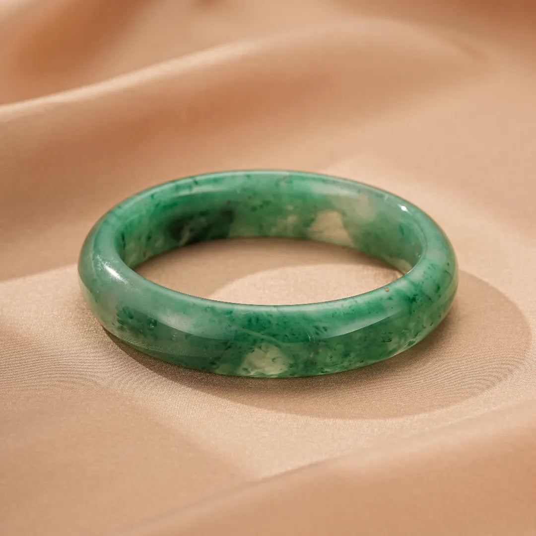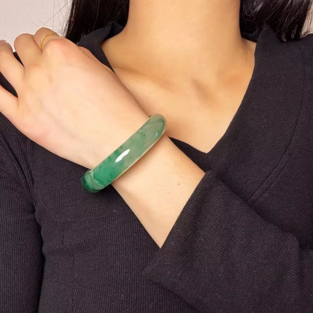 Laissez-vous séduire par Nuances Douces, un bracelet en jade naturel au design lisse et arrondi, révélant une teinte verte éclatante ponctuée de reflets nuancés. Chaque pièce est unique, sculptée avec précision dans du jade de qualité supérieure, disponible en Grade A, AA ou AAA, selon vos préférences.