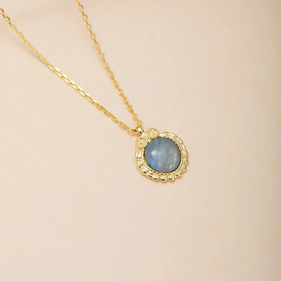 Élégant et chargé de symbolique, le collier Reflets Antiques sublime le cou avec éclat et mystère. En son centre, une labradorite ronde de 11 mm dévoile des reflets bleutés envoûtants, réputés pour protéger l’aura, favoriser l’intuition et éveiller la conscience intérieure.